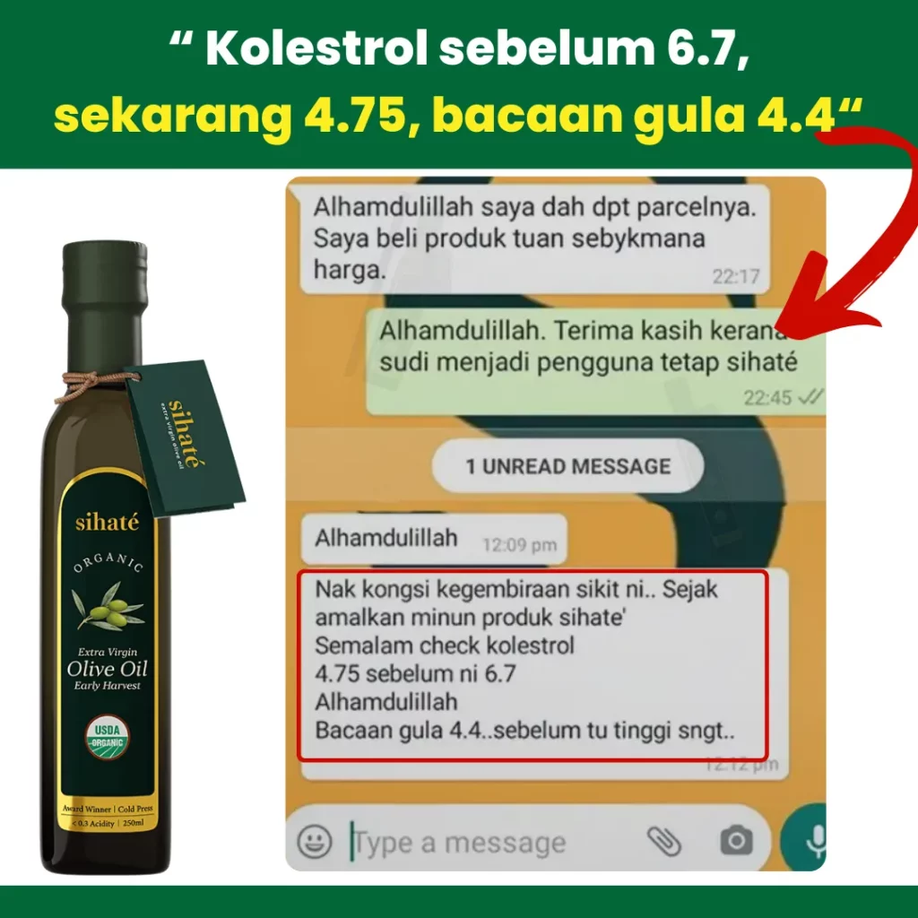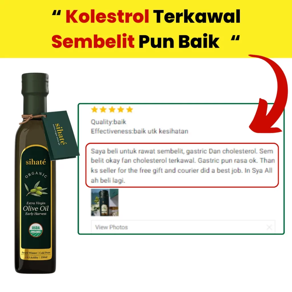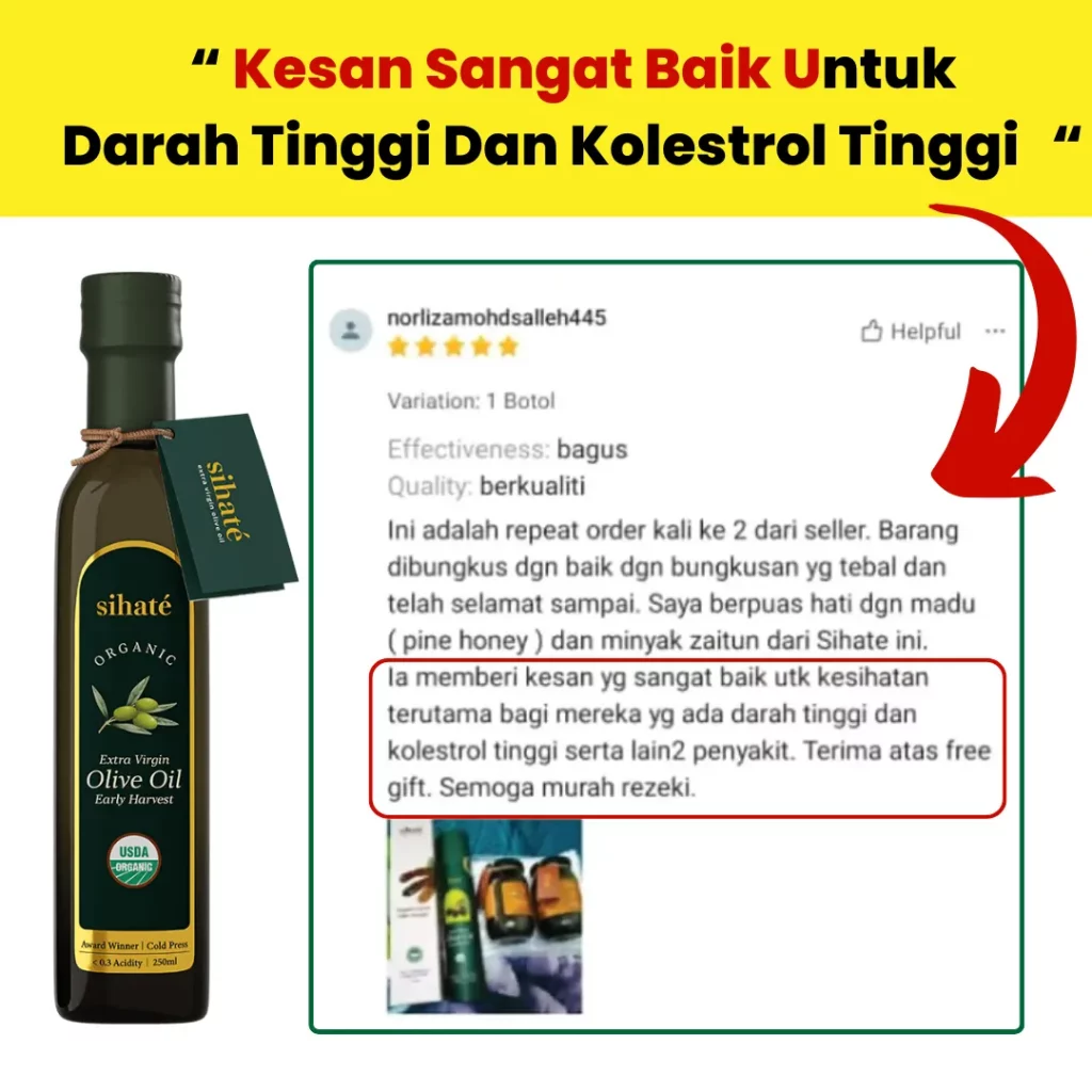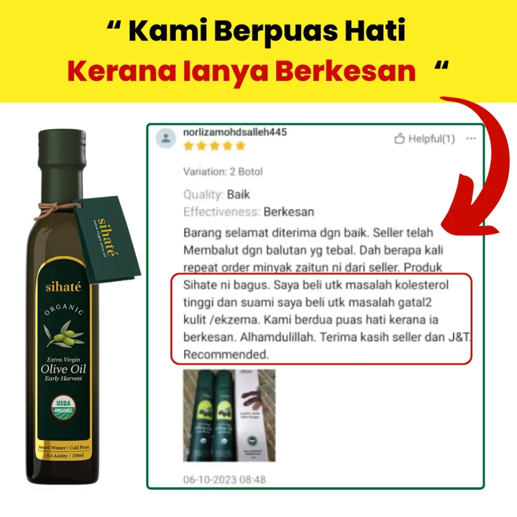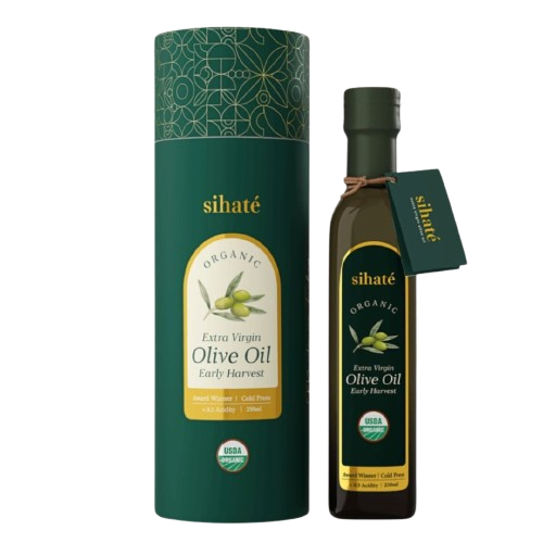 EVOO Sihaté berasal dari zaitun tuaian awal, menggunakan teknik perahan sejuk, dan diiktiraf organik oleh USDA. Minyak ini juga telah memenangi pelbagai anugerah antarabangsa dan diuji dua kali di makmal untuk memastikan keaslian dan kualiti.