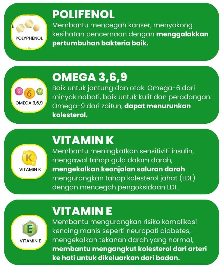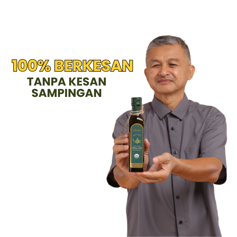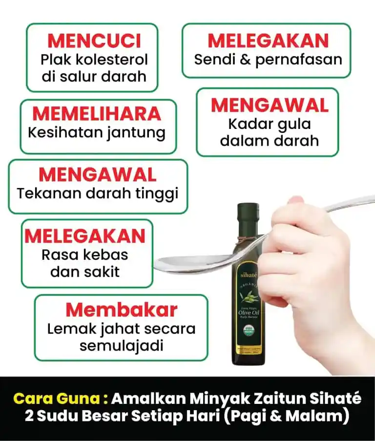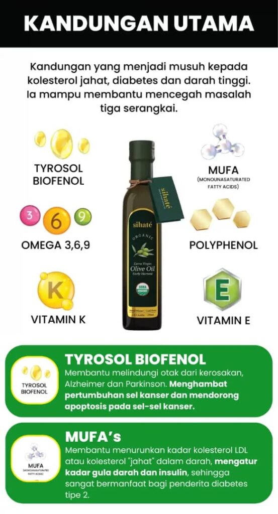 EVOO Sihaté kaya dengan polifenol, antioksidan, dan lemak tak tepu yang membantu meningkatkan sensitiviti insulin, mengurangkan tekanan darah, dan menurunkan kolesterol jahat (LDL).